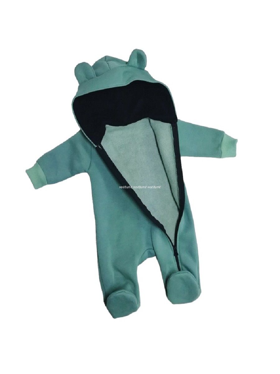 Комбинезон с закрытыми ножками, с капюшоном на подкладке, на молнии по всей длине и до конца одной ножки.