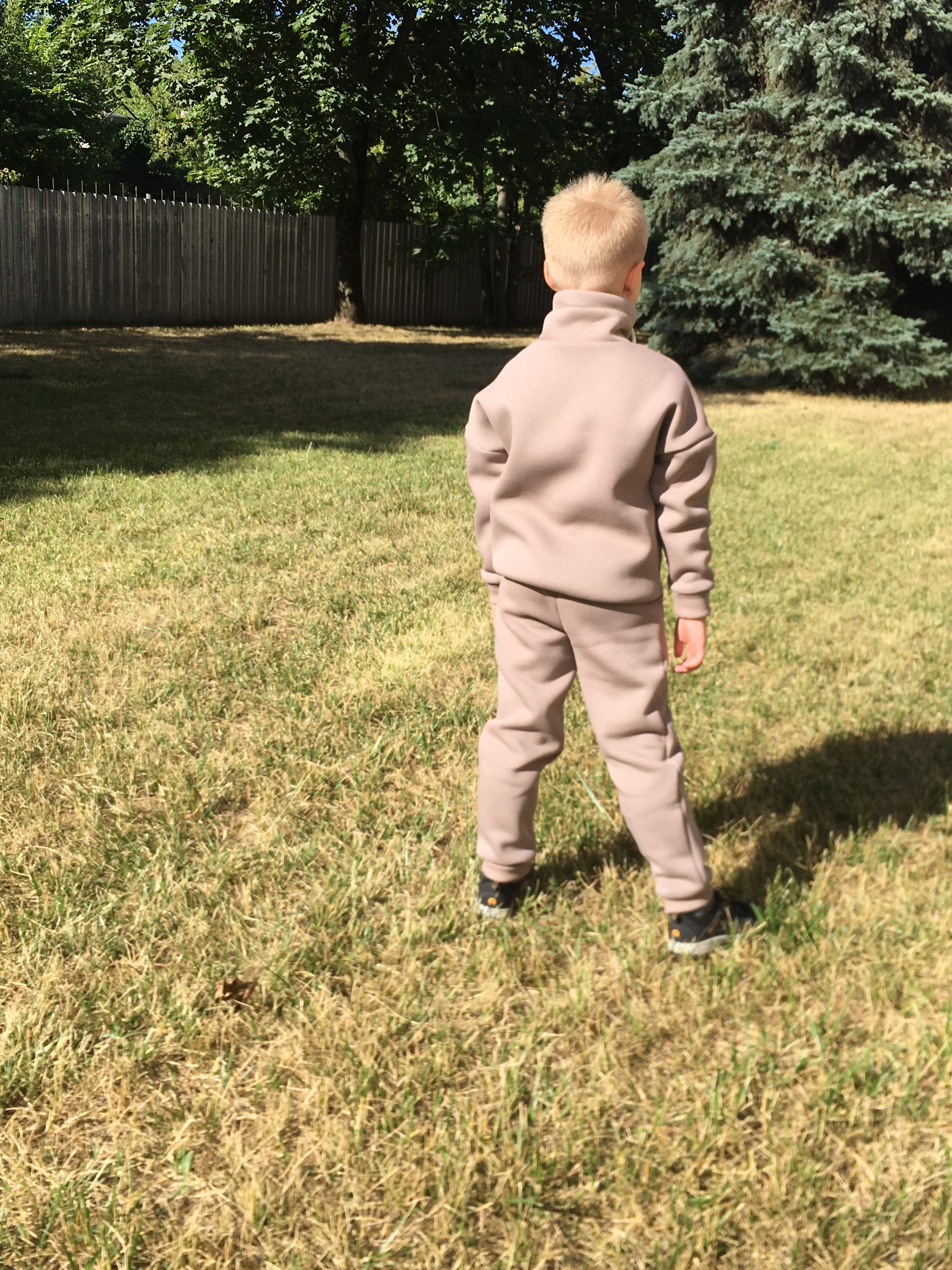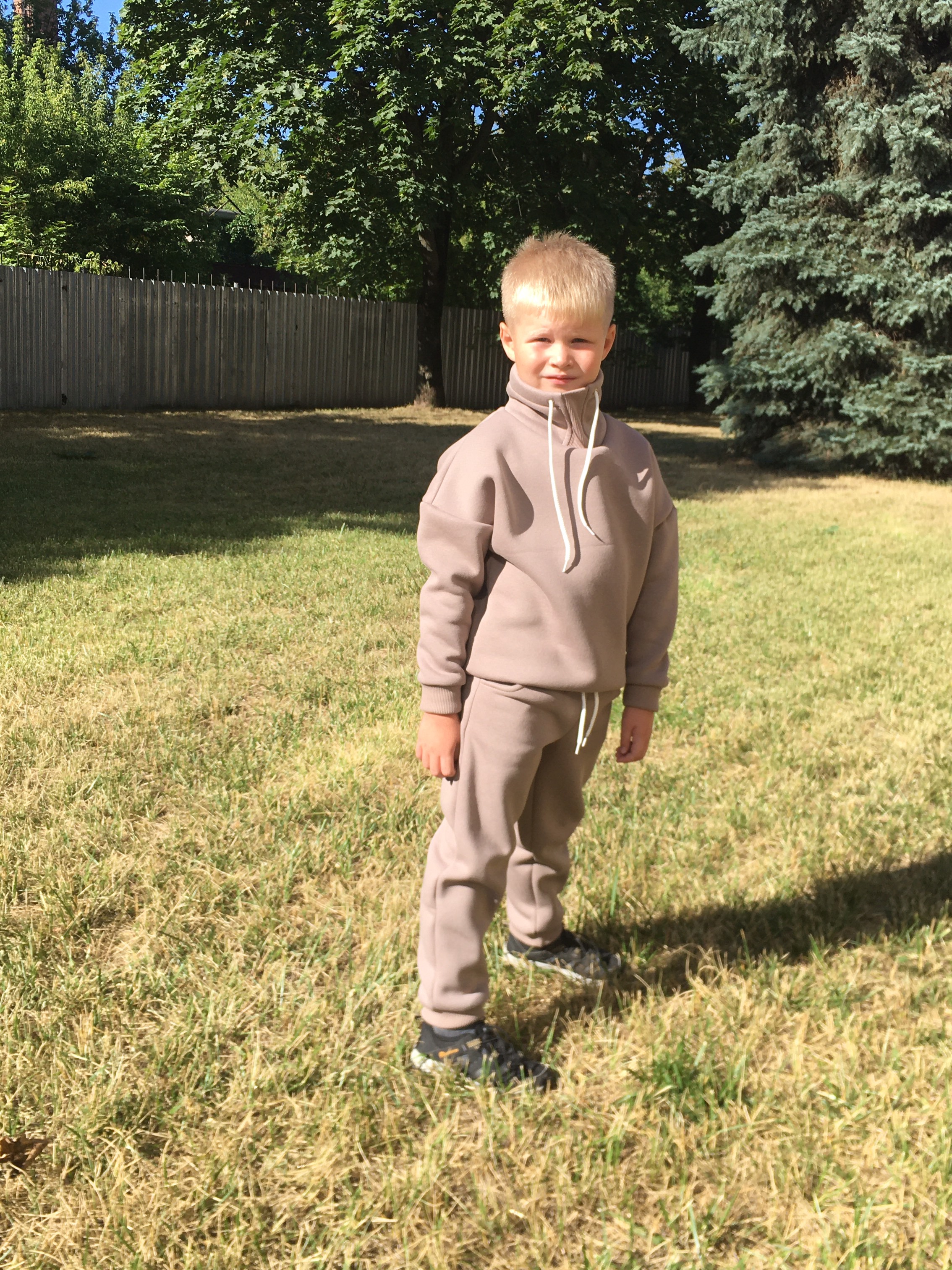 Костюм выполнен из футера 3-хнитки с начёсом. Состоит из свитшота и брюк. Брюки сверху на широкой резинке и со шнурком, снизу на манжете с отворотом. Свитшот с воротником-стойкой, украшен шнурком, снизу вставлена резинка, рукава на манжетах с отворотом.