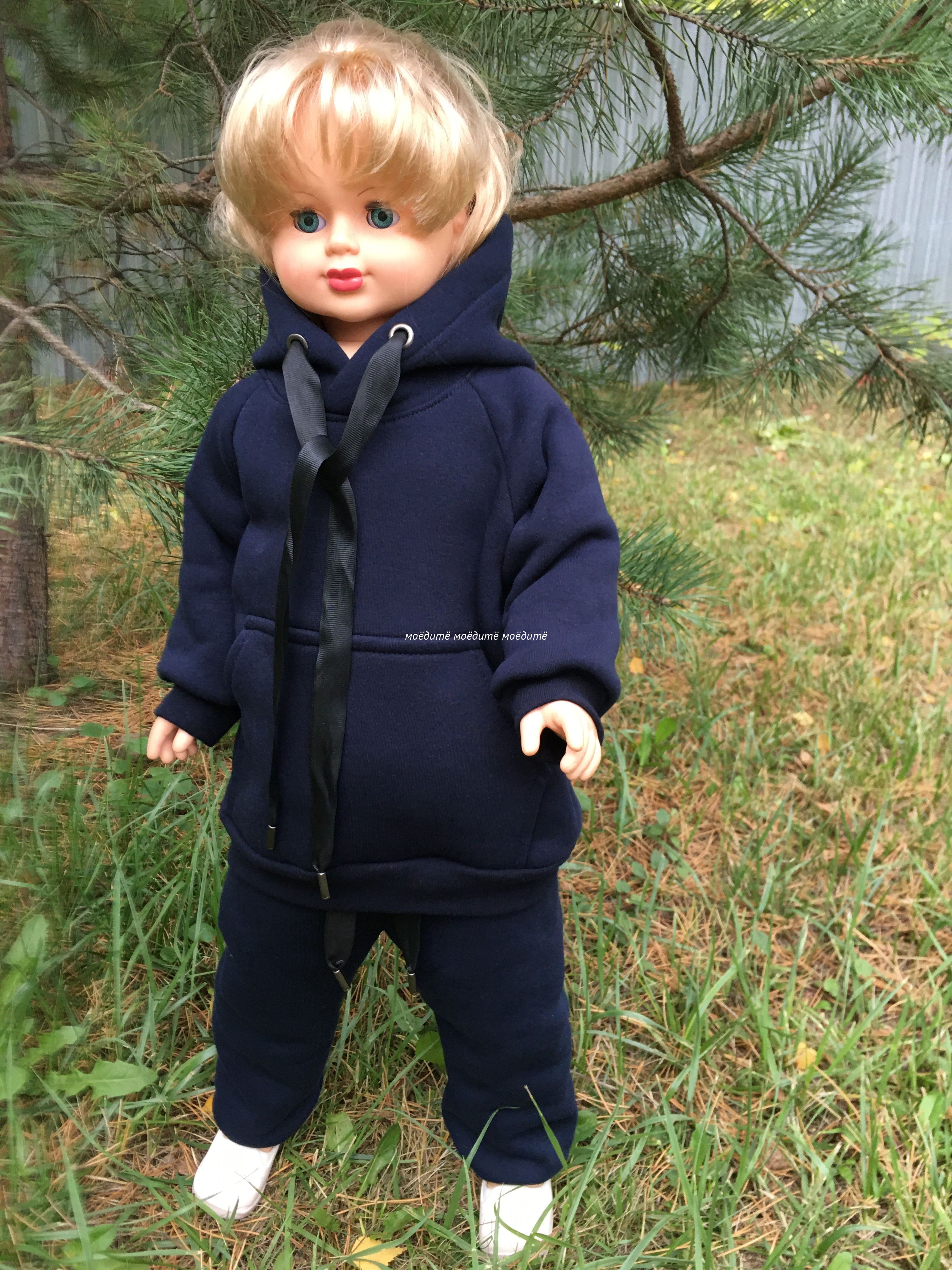 Костюм выполнен из футера трёхнитки с начёсом. Костюм состоит из толстовки с капюшоном, спереди с карманом "кенгуру", на рукавах манжеты. В комплект входят брюки сверху на широкой резинки, снизу на манжетах. Толстовка декорированы шнурком.