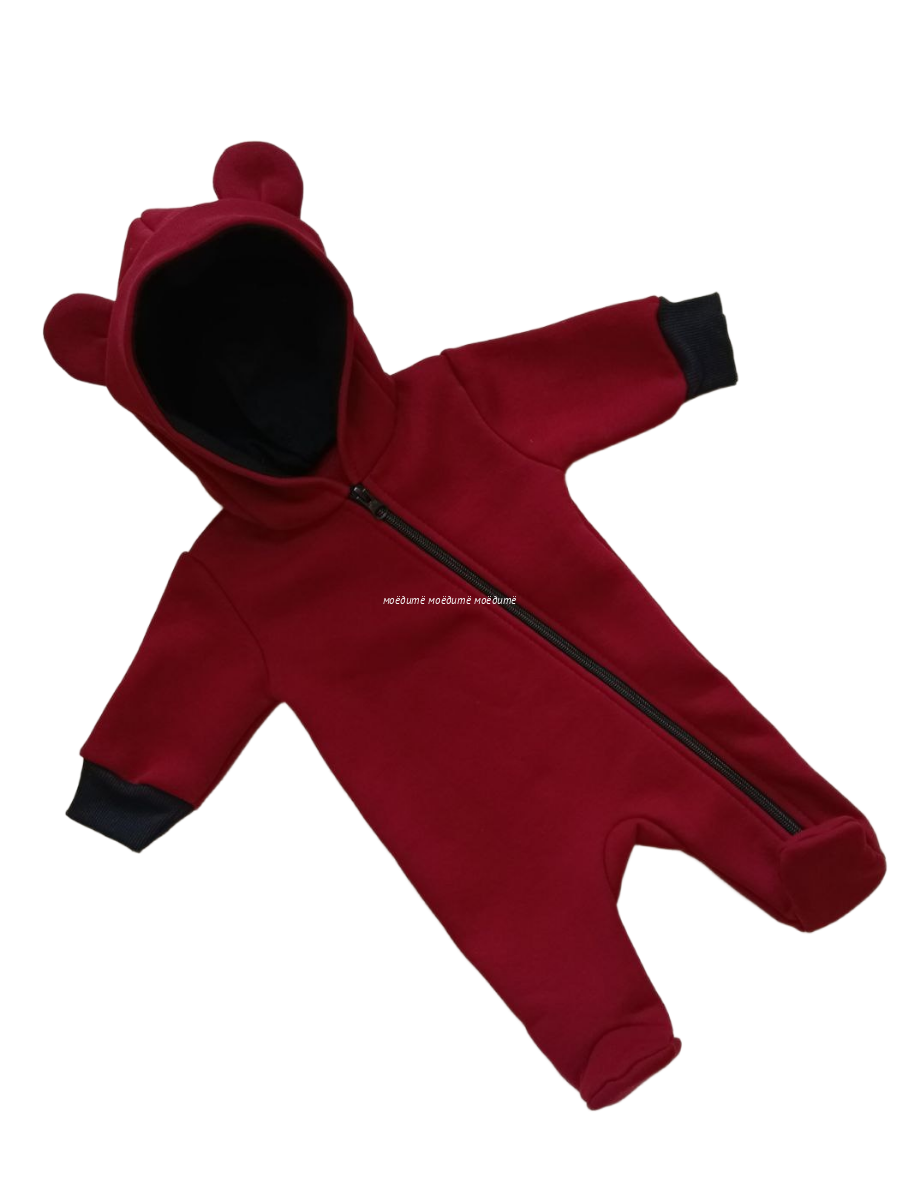 Комбинезон выполнен из футера двухнитки с начёсом. Спереди косая молния, капюшон на подкладке. У комбинезона закрытые ножки, на рукавах манжеты.
